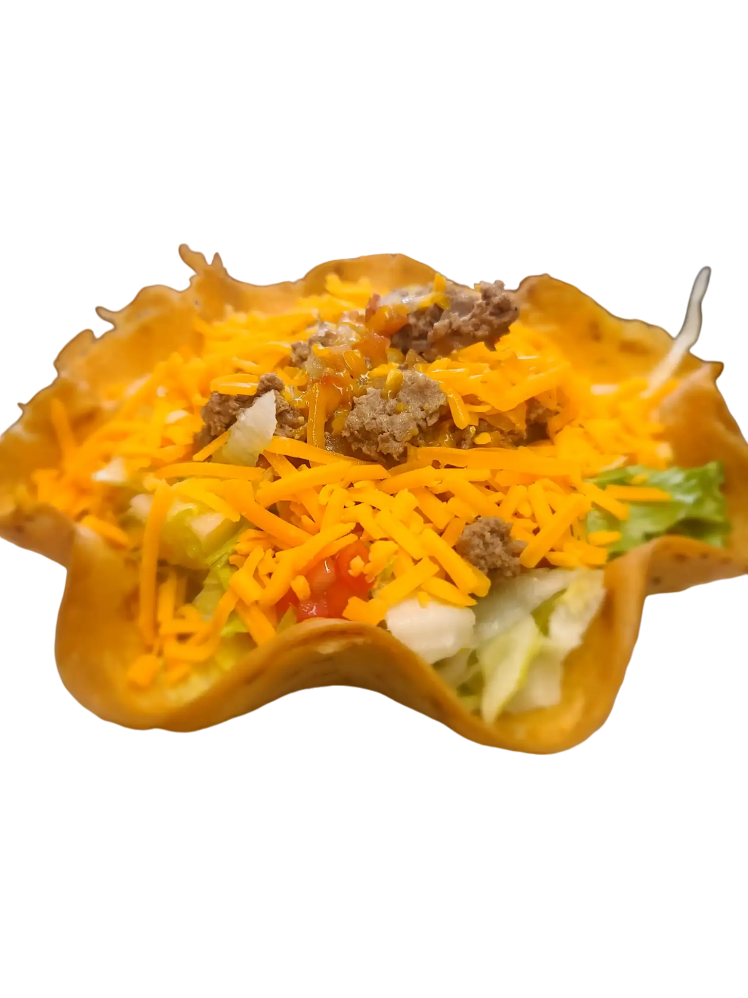 Crispy flour tortilla bowl filled with lettuce, your choice of meat, beans, cheese, tomatoes, sour cream, and guacamole.